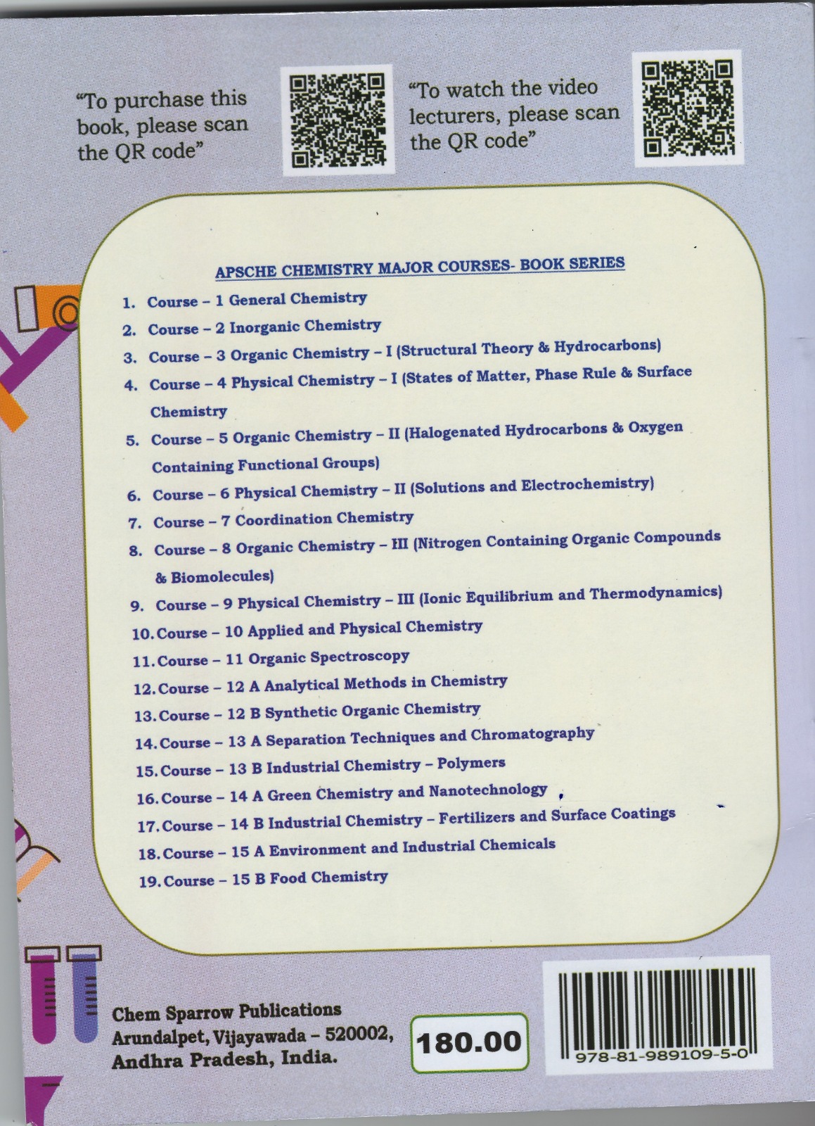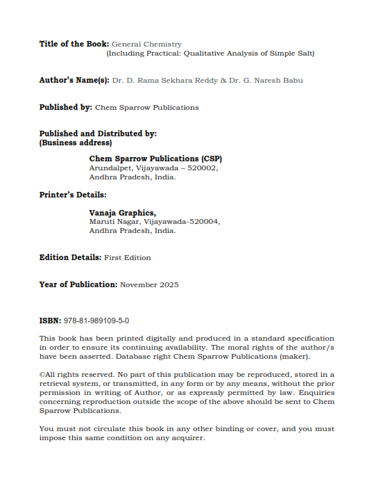 Through this series, our aim is to strengthen the foundation of chemical education in Andhra Pradesh by offering accessible, well-structured, and exam-oriented resources that foster analytical thinking and scientific curiosity. We hope that this book, General Chemistry (Course–1), will serve as a reliable guide and an inspiring companion for both students and educators, paving the way for deeper exploration of the fascinating world of chemistry.
